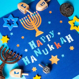 Religion concept of of jewish holiday Hanukkah with wooden dreidels (spinning top).