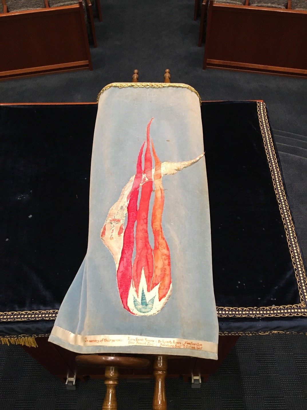 Our scroll was one of the hundreds found stored in a synagogue in the Michle district of Prague and were brought to London in 1964. In 1986, at the initiative of Gerhard Spies (of blessed memory), Scroll #909 was brought to Mamaroneck and took its place in WJC’s aron kodesh (holy ark). The scroll was refurbished and restored to kosher status by the sofer (Torah scribe) Rabbi Solomon Koenig.